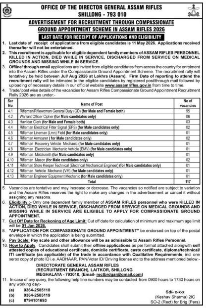 A total of 117 vacancies have been announced under the Compassionate Ground Appointment Scheme by Assam Rifles.